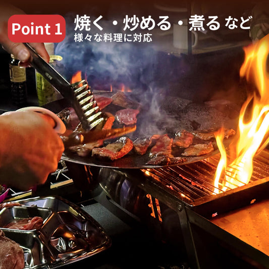 直径32センチの薄型マルチグリドルです。ガス、IH、直火に対応です。材質は鉄に麦飯石コーティングで高火力でも問題なく使用できます。取っ手は耐熱性の高いブナ材を使用しました。